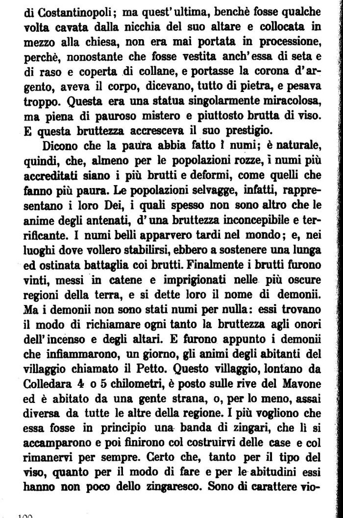 Dicono che la paura abbia fatto 1 numi; č naturale, quindi, che, almeno per le popolazioni rozze, i numi pių accreditati siano i pių brutti e deformi, come quelli che fanno pių paura. Le popolazioni selragge, infatti, rappresentano i loro Dei, i quali spesso non sono altro che le anime degli antenati, d'una bruttezza inconcepibile e terrificante. I numi belli apparTero tardi nel mondo; e, nei luoghi doTe Tollero stabilirsi, ebbero a sostenere una lunga ed ostinata battaglia coi brutti. Finalmente i brutti furono Tinti, messi in catene e imprigionati nelle pių oscure regioni della terra, e si dette loro il nome di demonii. Ma i demonii non sono stati numi per nulla: essi troTano il modo di richiamare ogni tanto la bruttezza agli onori dell'incenso e degli altari. E furono appunto i demonii che infiammarono, un giorno, gli animi degli abitanti del Tillaggio chiamato il Petto. Questo villaggio, lontano da Colledara 4 o 5 chilometri, č posto sulle rive del Mavone ed č abitato da una gente strana, o, per Io meno, assai diversa da tutte le altre della regione. I pių vogliono che essa fosse in principio una banda di zingari, che lė si accamparono e poi finirono col costruirvi delle case e col rimanervi per sempre. Certo che, tanto per il tipo del viso, quanto per il modo di fare e per le abitudini essi hanno non poco dello zingaresco. Sono di carattere vio-