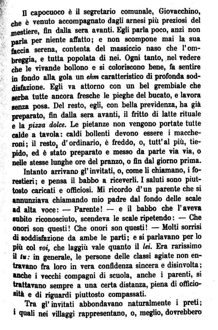 D capocuoco è il segretario comunale, Giovacchino, che è venuto accompagnato dagli arnesi più preziosi del mestiere, fin dalla sera avanti. Egli parla poco, anzi non parla per niente affatto; e non scompone mai la sua {accia serena, contenta del massiccio naso che l'ombreggia, e tutta popolata di nei. Ogni tanto, nel vedere che le vivande bollono e si coloriscono bene, fa sentire in fondo alla gola un ehm caratteristico di profonda soddisfazione. Egli va attorno con un bel grembiale che serba tutte ancora fresche le pieghe del bucato, e lavora senza posa. Del resto, egli, con bella previdenza, ha già preparato, fin dalla sera avanti, il frìtto di latte rituale e la pizza dolce. Le pietanze non vengono portate tutte calde a tavola: caldi bollenti devono essere i maccheroni; il resto, d'ordinario, è freddo, o, tutt'al più, tiepido, ed è stato preparato e messo da parte via via, o nelle stesse lunghe ore del pranzo, o fin dal giorno prima.