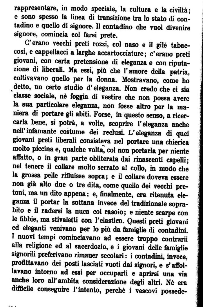rappresentare, in modo speciale, la cultura e la civiltà; e sono spesso la linea di transizione tra lo stato di contadino e quello di signore. Il contadino che vuol divenire signore, comincia col farsi prete.