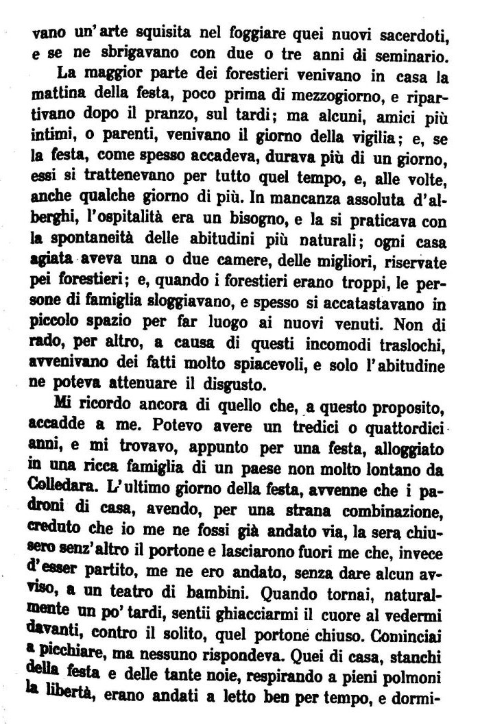 Mi ricordo ancora di quello che, a questo proposito, accadde a me. Potevo avere un tredici o quattordici anni, e mi trovavo, appunto per una festa, alloggiato in una ricca famiglia di un paese non molto lontano da Colledara. L'ultimo giorno della festa, avvenne che i padroni di casa, avendo, per una strana combinazione, creduto che io me ne fossi gią andato via, la sera chiusero senz'altro il portone e lasciarono fuori me che, invece d'esser partito, me ne ero andato, senza dare alcun avviso, a un teatro di bambini. Quando tornai, naturalmente un po' tardi, sentii ghiacciarmi il cuore al vedermi davanti, contro il solito, quel portone chiuso. Cominciai a picchiare, ma nessuno rispondeva. Quei di casa, stanchi della festa e delle tante noie, respirando a pieni polmoni * libertą, erano andati a letto ben per tempo, e dormi-