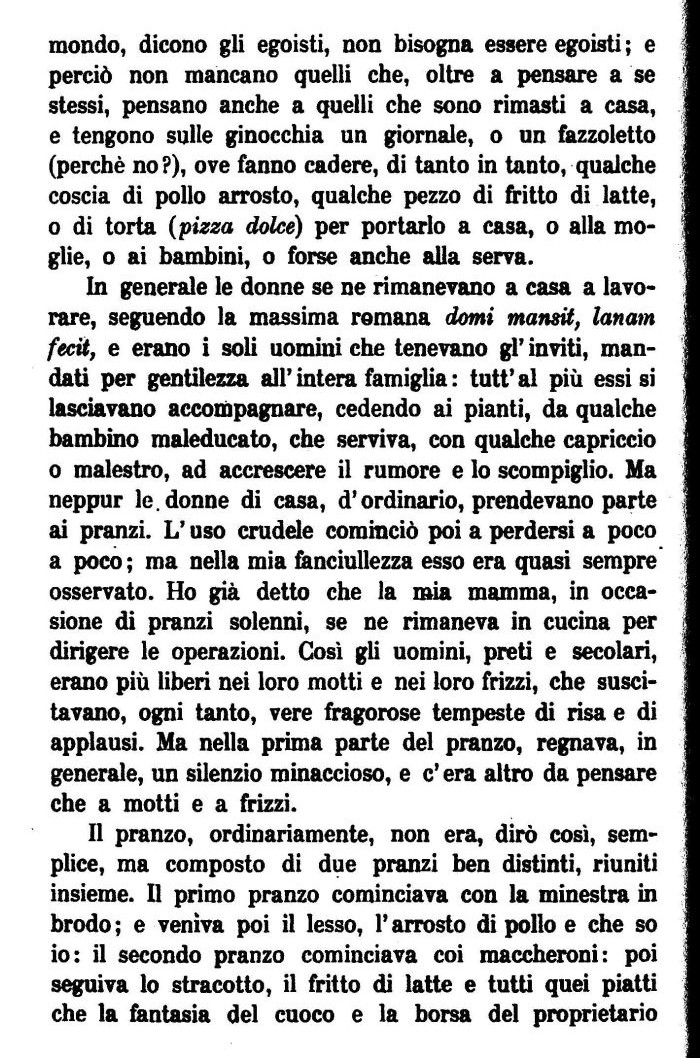 In generale le donne se ne rimanevano a casa a lavorare, seguendo la massima romana domi mansU, lanam fecit, e erano i soli uomini che tenevano gì' inviti, mandati per gentilezza all' intera famiglia : tutt'al più essisi lasciavano accompagnare, cedendo ai pianti, da qualche bambino maleducato, che serviva, con qualche capriccio o malestro, ad accrescere il rumore e lo scompiglio. Ma neppur le, donne di casa, d'ordinario, prendevano parte ai pranzi. L'uso crudele cominciò poi a perdersi a poco a poco ; ma nella mia fanciullezza esso era quasi sempre osservato. Ho già detto che la mia mamma, in occasione di pranzi solenni, se ne rimaneva in cucina per dirigere le operazioni. Così gli uomini, preti e secolari, erano più liberi nei loro motti e nei loro frizzi, che suscitavano, ogni tanto, vere fragorose tempeste di risa e di applausi. Ma nella prima parte del pranzo, regnava, in generale, un silenzio minaccioso, e c'era altro da pensare che a motti e a frizzi.