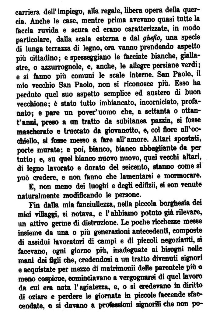 carriera dell'impiego, alla regale, libera opera della quercia. Anche le case, mentre prima avevano quasi tutte la faccia ruvida e scura ed erano caratterizzate, in modo particolare, dalla scala esterna e dal ghefio, una specie di lunga terrazza di legno, ora vanno prendendo aspetto più cittadino; e spesseggiano le facciate bianche, giallastre, o azzurrognole, e, anche, le allegre persiane verdi ; e si fanno più comuni le scale interne. San Paolo, il mio vecchio San Paolo, non si riconosce più. Esso ha perduto quel suo aspetto semplice ed austero di buon vecchione; è stato tutto imbiancato, incorniciato, profanato; e pare un pover'uomo che, a settanta o ottan-t'anni, preso a un tratto da subitanea pania, si fosse mascherato e truccato da giovanotto, e, col fiore all' occhiello, si fosse messo a fare all'amore. Altari spostati, porte murate; e poi, bianco, bianco abbagliante da per tutto; e, su quel bianco nuovo nuovo, quei vecchi altari, di legno lavorato e dorato del seicento, stanno come si può credere, e non fanno che lamentarsi e mormorare.