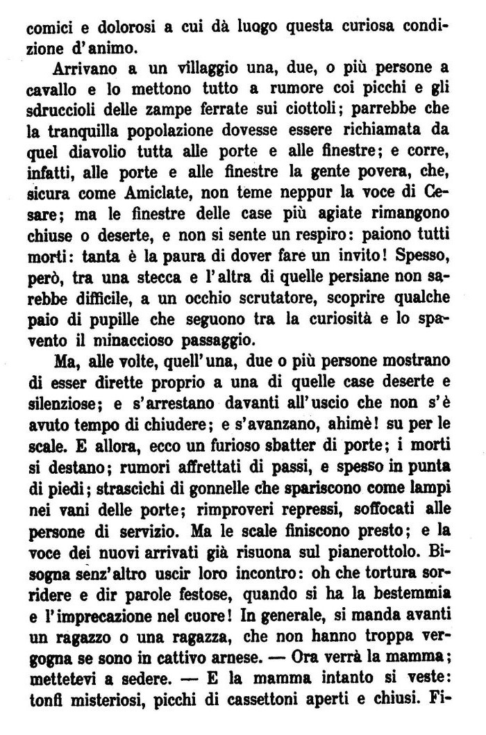 Arrivano a un villaggio una, due, o più persone a cavallo e lo mettono tutto a rumore coi picchi e gli sdruccioli delle zampe ferrate sui ciottoli; parrebbe che la tranquilla popolazione dovesse essere richiamata da quel diavolio tutta alle porte e alle finestre; e corre, infatti, alle porte e alle finestre la gente povera, che, sicura come Amiclate, non teme neppur la voce di Cesare; ma le finestre delle case più agiate rimangono chiuse o deserte, e non si sente un respiro : paiono tutti morti : tanta è la paura di dover fare un invito ! Spesso, però, tra una stecca e l'altra di quelle persiane non sarebbe difficile, a un occhio scrutatore, scoprire qualche paio di pupille che seguono tra la curiosità e lo spavento il minaccioso passaggio.