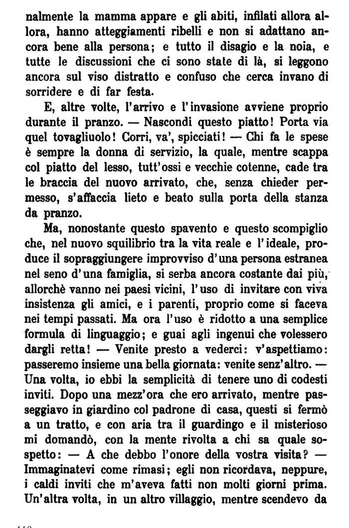 Ma, nonostante questo spavento e questo scompiglio che, nel nuovo squilibrio tra la vita reale e l'ideale, produce il sopraggiungere improvviso d'una persona estranea nel seno d'una famiglia, si serba ancora costante dai più, allorché vanno nei paesi vicini, l'uso di invitare con viva insistenza gii amici, e i parenti, proprio come si faceva nei tempi passati. Ma ora l'uso è ridotto a una semplice formula di linguaggio ; e guai agli ingenui che volessero dargli retta! — Venite presto a vederci: v'aspettiamo: passeremo insieme una bella giornata: venite senz'altro. — Una volta, io ebbi la semplicità di tenere uno di codesti inviti. Dopo una mezz'ora che ero arrivato, mentre passeggiavo in giardino col padrone di casa, questi si fermò a un tratto, e con aria tra il guardingo e il misterioso mi domandò, con la mente rivolta a chi sa quale sospetto: — A che debbo l'onore della vostra visita? — Immaginatevi come rimasi ; egli non ricordava, neppure, i caldi inviti che m'aveva fatti non molti giorni prima. Un'altra volta, in un altro villaggio, mentre scendevo da