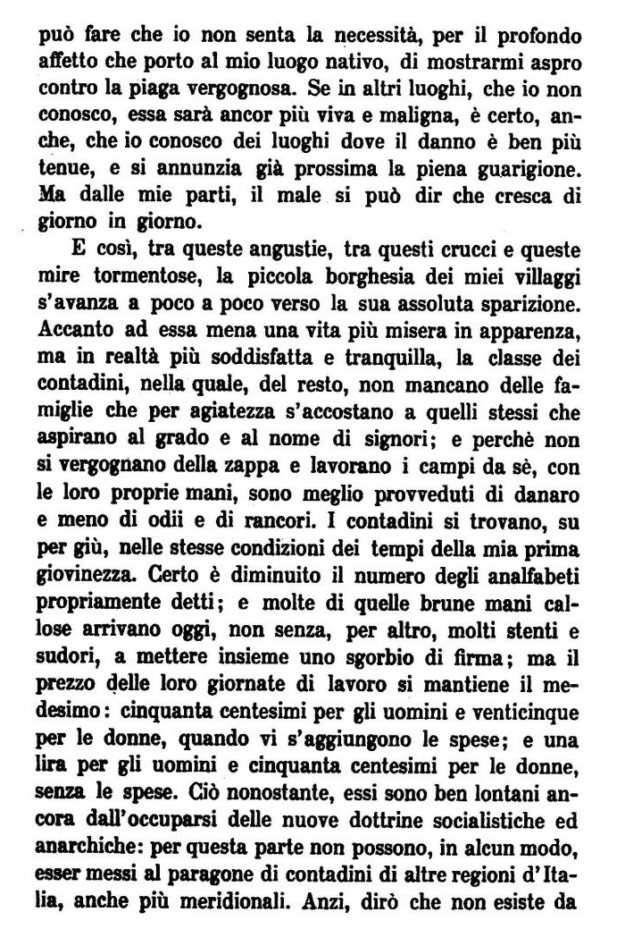 E così, tra queste angustie, tra questi crucci e queste mire tormentose, la piccola borghesia dei miei villaggi s'avanza a poco a poco verso la sua assoluta sparizione. Accanto ad essa mena una vita più misera in apparenza, ma in realtà più soddisfatta e tranquilla, la classe dei contadini, nella quale, del resto, non mancano delle famiglie che per agiatezza s'accostano a quelli stessi che aspirano al grado e al nome di signori; e perchè non si vergognano della zappa e lavorano i campi da sè, con le loro proprie mani, sono meglio provveduti di danaro e meno di odii e di rancori. I contadini si trovano, su per giù, nelle stesse condizioni dei tempi della mia prima giovinezza. Certo è diminuito il numero degli analfabeti propriamente detti; e molte di quelle brune mani callose arrivano oggi, non senza, per altro, molti stenti e sudori, a mettere insieme uno sgorbio di firma; ma il prezzo delle loro giornate di lavoro si mantiene il medesimo : cinquanta centesimi per gli uomini e venticinque per le donne, quando vi s'aggiungono le spese; e una lira per gli uomini e cinquanta centesimi per le donne, senza le spese. Ciò nonostante, essi sono ben lontani ancora dall'occuparsi delle nuove dottrine socialistiche ed anarchiche: per questa parte non possono, in alcun modo, esser messi al paragone di contadini di altre regioni d'Italia, anche più meridionali. Anzi, dirò che non esiste da