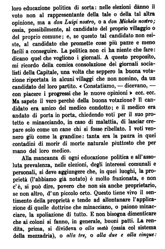 loro educazione politica di sorta : nelle elezioni dànno il voto non al rappresentante della tale o della tal altra opinione, ma a don Luigi nostro, o a don Michele nostro; ossia, possibilmente, al candidato del proprio villaggio o del proprio comune ; e, se questo tal candidato non esiste, al candidato che promette cose più pazze e meno facili a conseguire. La politica non ci ha niente che fare: dicano quel che vogliono i giornali. A questo proposito, mi ricordo della comica consolazione dei giornali socialisti della Capitale, una volta che seppero la buona votazione riportata in alcuni villaggi che non nomino, da un candidato del loro partito. « Constatiamo, — dicevano, — con piacere i progressi che le nuove opinioni » ecc. ecc. Ma sapete il vero perchè della buona votazione? Il candidato era amico del medico condotto; e il medico era andato di porta in porta, chiedendo voti per il suo protetto e minacciando, in caso di malattia, di lasciar crepare solo come un cane chi si fosse ribellato. I voti vennero giù come la grandine: tanta era la paura in quei contadini di morir di morte naturale piuttosto che per mano del loro medico.