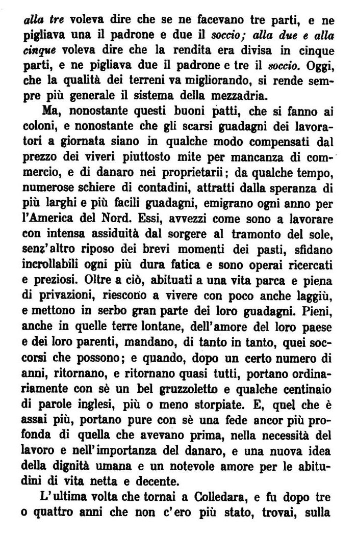 Ma, nonostante questi buoni patti, che si fanno ai coloni, e nonostante che gli scarsi guadagni dei lavoratori a giornata siano in qualche modo compensati dal prezzo dei viveri piuttosto mite per mancanza di commercio, e di danaro nei proprietarii ; da qualche tempo, numerose schiere di contadini, attratti dalla speranza di più larghi e più facili guadagni, emigrano ogni anno per l'America del Nord. Essi, avvezzi come sono a lavorare con intensa assiduità dal sorgere al tramonto del sole, senz'altro riposo dei brevi momenti dei pasti, sfidano incrollabili ogni più dura fatica e sono operai ricercati e preziosi. Oltre a ciò, abituati a una vita parca e piena di privazioni, riescono a vivere con poco anche laggiù, e mettono in serbo gran parte dei loro guadagni. Pieni, anche in quelle terre lontane, dell'amore del loro paese e dei loro parenti, mandano, di tanto in tanto, quei soccorsi che possono; e quando, dopo un certo numero di anni, ritornano, e ritornano quasi tutti, portano ordinariamente con sè un bel gruzzoletto e qualche centinaio di parole inglesi, più o meno storpiate. E, quel che è assai più, portano pure con sè una fede ancor più profonda di quella che avevano prima, nella necessità del lavoro e nell'importanza del danaro, e una nuova idea della dignità umana e un notevole amore per le abitudini di vita netta e decente.