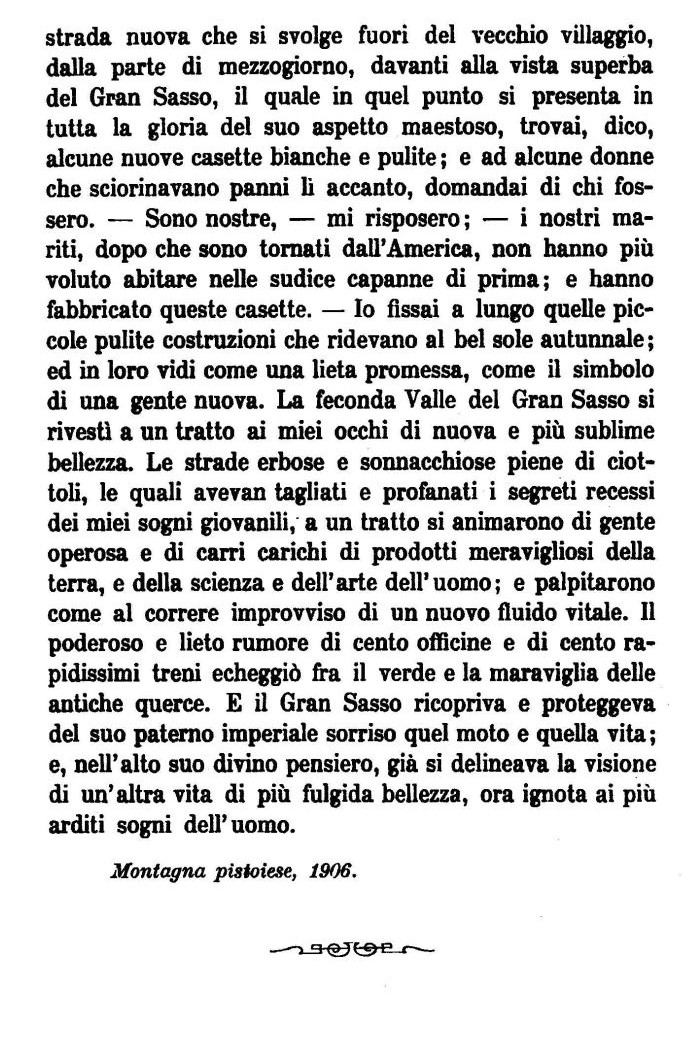 strada nuova che si svolge fuori del vecchio villaggio, dalla parte di mezzogiorno, davanti alla vista superba del Gran Sasso, il quale in quel punto si presenta in tutta la gloria del suo aspetto maestoso, trovai, dico, alcune nuove casette bianche e pulite ; e ad alcune donne che sciorinavano panni li accanto, domandai di chi fossero. — Sono nostre, — mi risposero ; — i nostri mariti, dopo che sono tornati dall'America, non hanno più voluto abitare nelle sudice capanne di prima; e hanno fabbricato queste casette. — Io fissai a lungo quelle piccole pulite costruzioni che ridevano al bel sole autunnale; ed in loro vidi come una lieta promessa, come il simbolo di una gente nuova. La feconda Valle del Gran Sasso si rivestì a un tratto ai miei occhi di nuova e più sublime bellezza. Le strade erbose e sonnacchiose piene di ciottoli, le quali avevan tagliati e profanati i segreti recessi dei miei sogni giovanili, a un tratto sì animarono dì gente operosa e di carri carichi di prodotti meravigliosi della terra, e della scienza e dell'arte dell'uomo; e palpitarono come al correre improvviso di un nuovo fluido vitale. Il poderoso e lieto rumore di cento officine e di cento rapidissimi treni echeggiò fra il verde e la maraviglia delle antiche querce. E il Gran Sasso ricopriva e proteggeva del suo paterno imperiale sorriso quel moto e quella vita; e, nell'alto suo divino pensiero, già si delineava la visione di un'altra vita di più fulgida bellezza, ora ignota ai più arditi sogni dell'uomo.