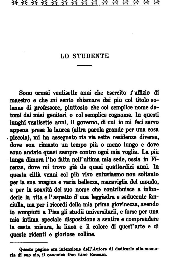 Sono ormai ventisette anni che esercito l'uffizio di maestro e che mi sento chiamare dai pił col titolo solenne di professore, piuttosto che col semplice nome datomi dai miei genitori o col semplice cognome. In questi lunghi ventisette anni, il governo, di cui io mi feci servo appena presa la laurea (altra parola grande per una cosa piccola), mi ha assegnato via via sette residenze diverse, dove son rimasto un tempo pił o meno lungo e dove sono andato quasi sempre contro ogni mia voglia. La pił lunga dimora l'ho fatta nell'ultima mia sede, ossia in Firenze, dove mi trovo gią da quasi quattordici anni. In questa cittą venni col pił vivo entusiasmo non soltanto per la sua magica e varia bellezza, maraviglia del mondo, e per la soavitą del suo nome che contribuisce a infonderle la vita e l'aspetto d'una leggiadra e seducente fanciulla, ma per i ricordi della mia prima giovinezza, avendo io compiuti a Pisa gli studii universitarii, e forse per una mia intima speciale disposizione a sentire e comprendere la casta misura, la linea e il colore di quest'arte e di queste ridenti e gloriose colline.
