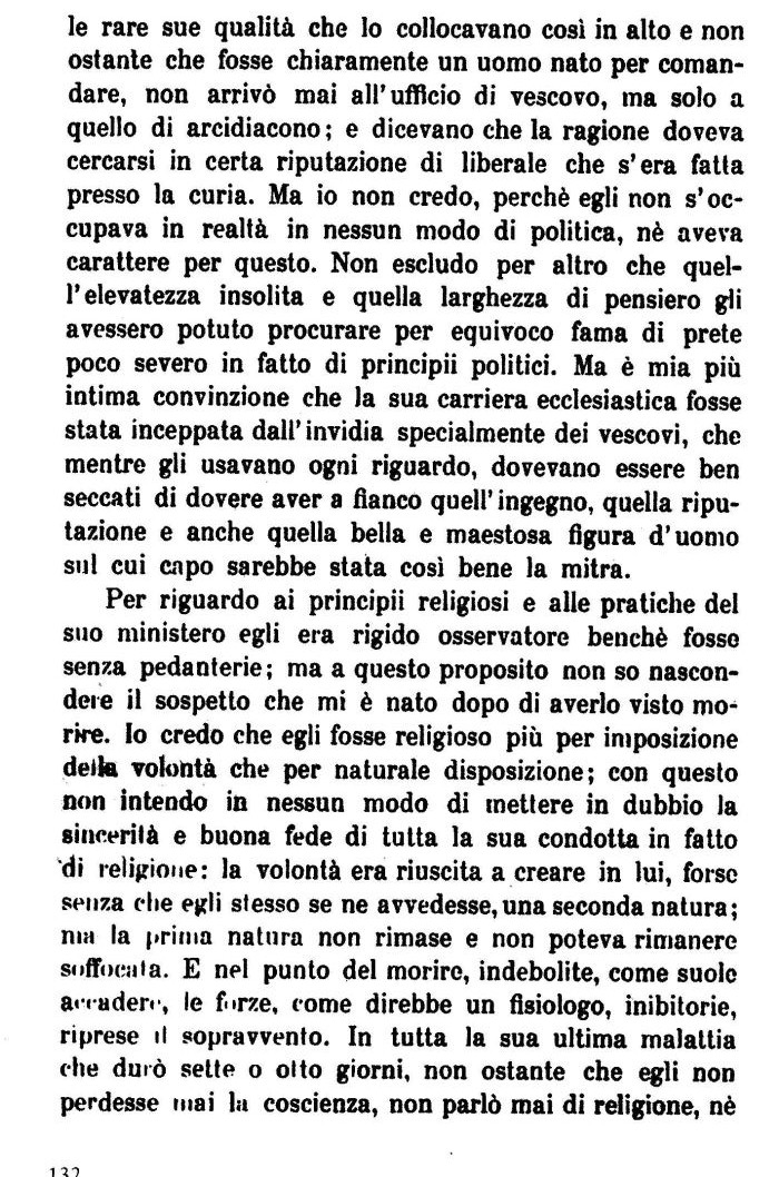 Per riguardo ai principii religiosi e alle pratiche del suo ministero egli era rigido osservatore benché fosse senza pedanterie; ma a questo proposito non so nascondere il sospetto che mi è nato dopo di averlo visto morire. Io credo che egli fosse religioso più per imposizione della volontà che per naturale disposizione; con questo non intendo in nessun modo di mettere in dubbio la sincerità e buona fede di tutta la sua condotta in fatto di religione: la volontà era riuscita a creare in lui, forse senza che egli stesso se ne avvedesse,una seconda natura; ma la grinta natura non rimase e non poteva rimanere soffocala. E nel punto del morire, indebolite, come suole a« < ader«', le forze, come direbbe un fisiologo, inibitorie, riprese il sopravvento. In tutta la sua ultima malattia che durò sette o otto giorni, non ostante che egli non perdesse mai la coscienza, non parlò mai di religione, nè