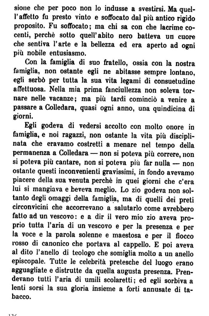 Egli godeva di vedersi accolto con molto onore in famiglia, e noi ragazzi, non ostante la vita più disciplinata che eravamo costretti a menare nel tempo della permanenza a Colledara — non si poteva più correre, non si poteva più cantare, non si poteva più far nulla — non ostante questi inconvenienti gravissimi, in fondo avevamo piacere della sua venuta perchè in quei giorni che c'era lui si mangiava e beveva meglio. Lo zio godeva non soltanto degli omaggi della famiglia, ma di quelli dei preti circonvicini che accorrevano a salutarlo come avrebbero fatto ad un vescovo : e a dir il vero mio zio aveva proprio tutta l'aria di un vescovo e per la presenza e per la voce e la parola solenne e maestosa e per il fiocco rosso di canonico che portava al cappello. E poi aveva al dito l'anello di teologo che somiglia molto a un anello episcopale. Tutte le celebrità pretesche del luogo erano agguagliate e distrutte da quella augusta presenza. Prendevano tutti l'aria di umili scolaretti; ed egli sorbiva a lenti sorsi la sua gloria insieme a forti annusate di tabacco.