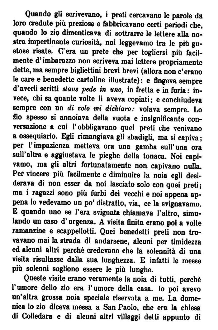 Quando gli scrivevano, i preti cercavano le parole da loro credute pił preziose e fabbricavano certi periodi che, quando lo zio dimenticava di sottrarre le lettere alla nostra impertinente curiositą, noi leggevamo tra le pił gustose risate. C'era un prete che per togliersi pił facilmente d'imbarazzo non scriveva mai lettere propriamente dette, ma sempre bigliettini brevi brevi (allora non c'erano le care e benedette cartoline illustrate): e fingeva sempre d'averli scritti stans pede in uno, in fretta e in furia: invece, chi sa quante volte li aveva copiati ; e conchiudeva sempre con un di volo mi dichiaro: volava sempre. Lo zio spesso si annoiava della vuota e insignificante conversazione a cui l'obbligavano quei preti che venivano a ossequiarlo. Egli rimangiava gli sbadigli, ma si capiva ; per l'impazienza metteva ora una gamba sull'una ora sull'altra e aggiustava le pieghe della tonaca. Noi capivamo, ma gli altri fortunatamente non capivano nulla. Per vincere pił facilmente e diminuire la noia egli desiderava di non esser da noi lasciato solo con quei preti; ma i ragazzi sono pił furbi dei vecchi e noi appena appena lo vedevamo un po' distratto, via, ce la svignavamo. E quando uno se l'era svignata chiamava l'altro, simulando un caso d'urgenza. A visita finita erano poi a volte ramanzine e scappellotti. Quei benedetti preti non trovavano mai la strada di andarsene, alcuni per timidezza ed alcuni altri perchč credevano che la solennitą di una visita risultasse dalla sua lunghezza. E infatti le messe pił solenni sogliono essere le pił lunghe.