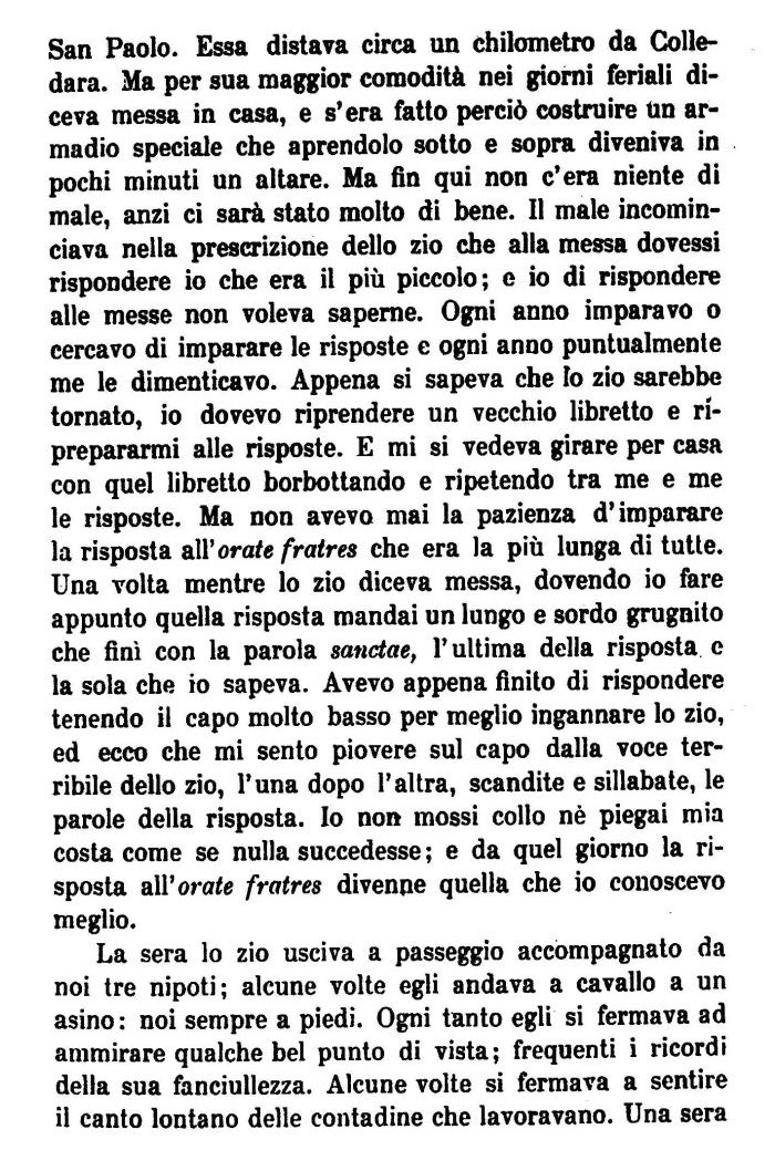 San Paolo. Essa distava circa un chilometro da Colledara. Ma per sua maggior comodità nei giorni feriali diceva messa in casa, e s'era fatto perciò costruire un armadio speciale che aprendolo sotto e sopra diveniva in pochi minuti un altare. Ma fin qui non c'era niente di male, anzi ci sarà stato molto di bene. Il male incominciava nella prescrizione dello zio che alla messa dovessi rispondere io che era il più piccolo; e io di rispondere alle messe non voleva saperne. Ogni anno imparavo o cercavo di imparare le risposte e ogni anno puntualmente me le dimenticavo. Appena si sapeva che Io zio sarebbe tornato, io dovevo riprendere un vecchio libretto e ri-prepararmi alle risposte. E mi si vedeva girare per casa con quel libretto borbottando e ripetendo tra me e me le risposte. Ma non avevo mai la pazienza d'imparare la risposta all' orate fratres che era la più lunga di tutte. Una volta mentre lo zio diceva messa, dovendo io fare appunto quella risposta mandai un lungo e sordo grugnito che finì con la parola sanctae, l'ultima della risposta e la sola che io sapeva. Avevo appena finito di rispondere tenendo il capo molto basso per meglio ingannare lo zio, ed ecco che mi sento piovere sul capo dalla voce terribile dello zio, l'una dopo l'altra, scandite e sillabate, le parole della risposta. Io non mossi collo nè piegai mia costa come se nulla succedesse ; e da quel giorno la risposta ali1 orate fratres divenne quella che io conoscevo meglio.