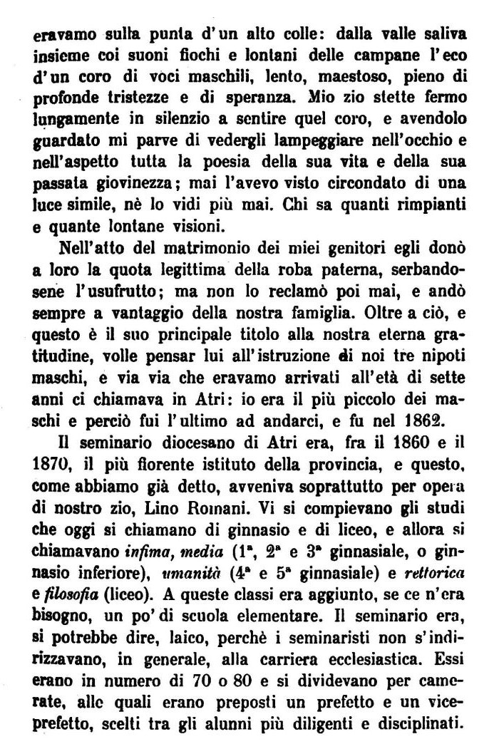 Il seminario diocesano di Atri era, fra il 1860 e il 1870, il più fiorente istituto della provincia, e questo, come abbiamo già detto, avveniva soprattutto per opera di nostro zio, Lino Romani. Vi si compievano gli studi che oggi si chiamano di ginnasio e di liceo, e allora si chiamavano infima, media (1", T e 3" ginnasiale, o ginnasio inferiore), umanità (4* e 5* ginnasiale) e rettorica e filosofia (liceo). A queste classi era aggiunto, se ce n'era bisogno, un po'di scuola elementare. Il seminario era, si potrebbe dire, laico, perchè i seminaristi non s'indirizzavano, in generale, alia carriera ecclesiastica. Essi erano in numero di 70 o 80 e si dividevano per camerate, allo quali erano preposti un prefetto e un viceprefetto, scelti tra gli alunni più diligenti e disciplinati.