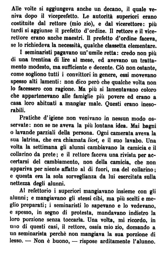 Al refettorio i superiori mangiavano insieme con gli alunni ; e mangiavano gli stessi cibi, ma più scelti e meglio preparati; i seminaristi lo sapevano e lo vedevano, e spesso, in segno di protesta, mandavano indietro la loro porzione senza toccarla. Una volta, mi ricordo, in uno di questi casi, il rettore, ossia mio zio, domando a un seminarista perchè non mangiava la sua porzione di lesso. — Non è buono, — rispose arditamente l'alunno.