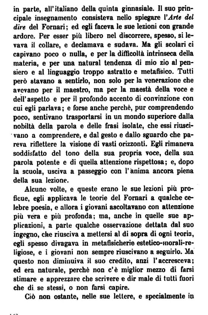 in parte, all' italiano della quinta ginnasiale. Il suo principale insegnamento consisteva nello spiegare YArte del dire del Fornari ; ed egli faceva le sue lezioni con grande ardore. Per esser più libero nel discorrere, spesso, si levava il collare, e declamava e sudava. Ma gli scolari ci capivano poco o nulla, e per la difficoltà intrinseca della materia, e per una naturai tendenza di mio zio al pensiero e al linguaggio troppo astratto e metafìsico. Tutti però stavano a sentirlo, non solo per la venerazione che avevano per il maestro, ma per la maestà della voce e dell'aspetto e per il profondo accento di convinzione con cui egli parlava ; e forse anche perchè, pur comprendendo poco, sentivano trasportarsi in un mondo superiore dalla nobiltà della parola e delle frasi isolate, che essi riuscivano a comprendere, e dal gesto e dallo sguardo che pareva riflettere la visione di vasti orizzonti. Egli rimaneva soddisfatto del tono della sua propria voce, della sua parola potente e di quella attenzione rispettosa; e, dopo la scuola, usciva a passeggio con l'anima ancora piena della sua lezione.