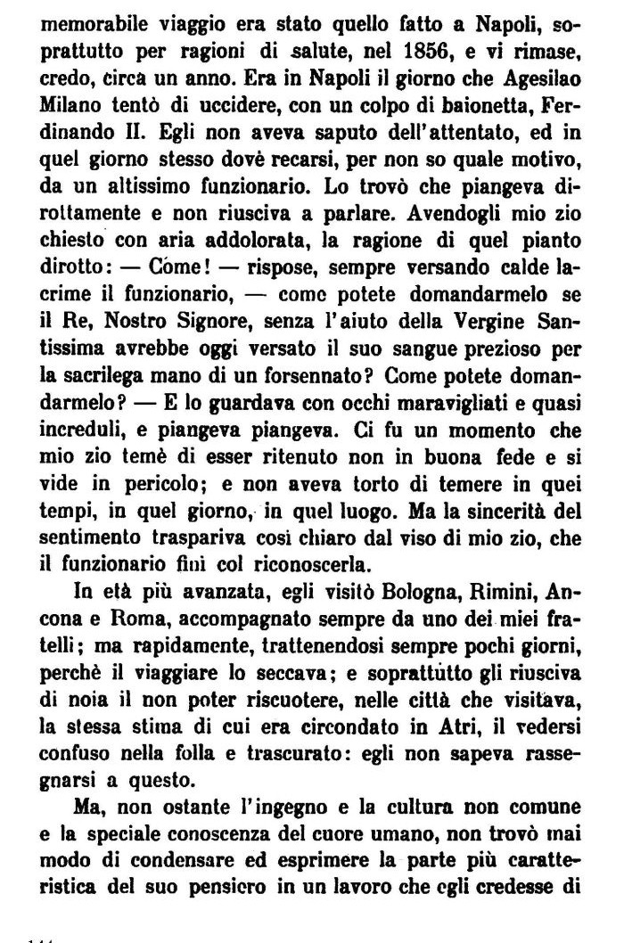 memorabile viaggio era stato quello fatto a Napoli, soprattutto per ragioni di salute, nel 1856, e vi rimase, credo, circa un anno. Era in Napoli il giorno che Agesilao Milano tentò di uccidere, con un colpo di baionetta, Ferdinando II. Egli non aveva saputo dell'attentato, ed in quel giorno stesso dovè recarsi, per non so quale motivo, da un altissimo funzionario. Lo trovò che piangeva dirottamente e non riusciva a parlare. Avendogli mio zio chiesto con aria addolorata, la ragione di quel pianto dirotto : — Còme ! — rispose, sempre versando calde lacrime il funzionario, — come potete domandarmelo se il Re, Nostro Signore, senza l'aiuto della Vergine Santissima avrebbe oggi versato il suo sangue prezioso per la sacrilega mano di un forsennato? Come potete domandarmelo? — E lo guardava con occhi maravigliati e quasi increduli, e piangeva piangeva. Ci fu un momento che mio zio temè di esser ritenuto non in buona fede e si vide in pericolo; e non aveva torto di temere in quei tempi, in quei giorno, in quel luogo. Ma la sincerità del sentimento traspariva cosi chiaro dal viso di mio zio, che il funzionario finì col riconoscerla.