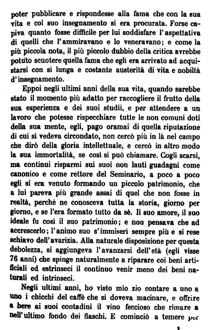 Eppoi negli ultimi anni della sua vita, quando sarebbe stato il momento più adatto per raccogliere il frutto della sua esperienza e dei suoi studii, e per attendere a un lavoro che potesse rispecchiare tutte le non comuni doti della sua mente, egli, pago oramai di quella riputazione di cui si vedeva circondato, non cercò più in là nel campo che dirò della gloria intellettuale, e cercò in altro modo la sua immortalità, se così si può chiamare. Cogli scarsi, ma continui risparmi sui suoi non lauti guadagni come canonico e come rettore del Seminario, a poco a poco egli si era venuto formando un piccolo patrimonio, che a lui pareva più grande assai di quel che non fosse in realtà, perchè ne conosceva tutta la storia, giorno per giorno, e se l'era formato tutto da sé. Il suo amore, il suo ideale fu così il suo patrimonio ; e non pensava che ad accrescerlo; l'animo suo s'immiserì sempre più e si rese schiavo dell'avarizia. Alla naturale disposizione per questa debolezza, si aggiungeva l'avanzarsi dell'età (egli visse 76 anni) che spinge naturalmente a riparare coi beni artificiali ed estrinseci il continuo venir meno dei beni naturali ed intrinseci.