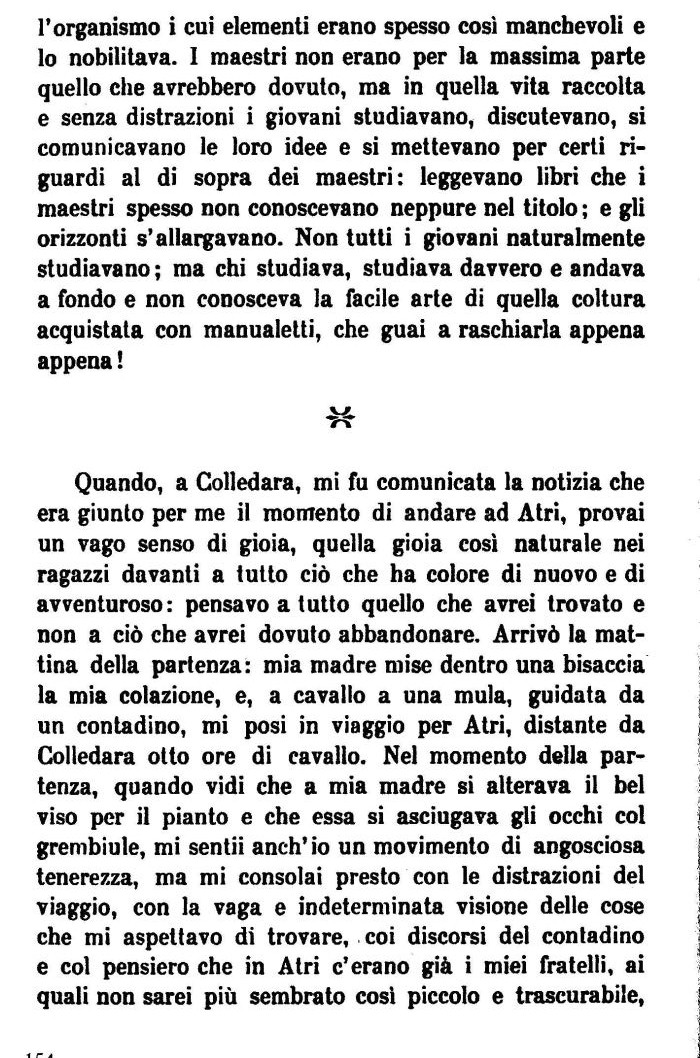 Quando, a Colledara, mi fu comunicata la notizia che era giunto per me il momento di andare ad Atri, provai un vago senso di gioia, quella gioia così naturale nei ragazzi davanti a tutto ciò che ha colore di nuovo e di avventuroso: pensavo a tutto quello che avrei trovato e non a ciò che avrei dovuto abbandonare. Arrivò la mattina della partenza: mia madre mise dentro una bisaccia la mia colazione, e, a cavallo a una mula, guidata da un contadino, mi posi in viaggio per Atri, distante da Colledara otto ore di cavallo. Nel momento della partenza, quando vidi che a mia madre si alterava il bel viso per il pianto e che essa si asciugava gli occhi col grembiule, mi sentii anch'io un movimento di angosciosa tenerezza, ma mi consolai presto con le distrazioni del viaggio, con la vaga e indeterminata visione delle cose che mi aspettavo di trovare, coi discorsi del contadino e col pensiero che in Atri c'erano già i miei fratelli, ai quali non sarei più sembrato cosi piccolo e trascurabile,