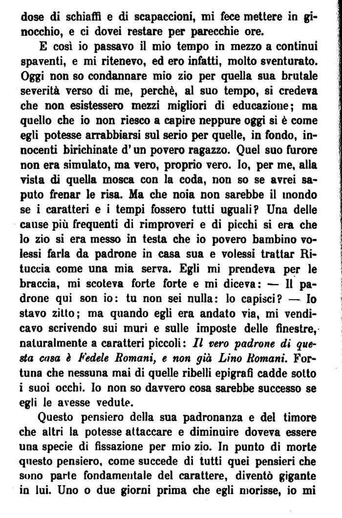 E cosi io passavo il mio tempo in mezzo a continui spaventi, e mi ritenevo, ed ero infatti, molto sventurato. Oggi non so condannare mio zio per quella sua brutale severità verso di me, perchè, al suo tempo, si credeva che non esistessero mezzi migliori di educazione; ma quello che io non riesco a capire neppure oggi si è come egli potesse arrabbiarsi sul serio per quelle, in fondo, innocenti birichinate d'un povero ragazzo. Quei suo furore non era simulato, ma vero, proprio vero. Io, per me, alla vista di quella mosca con la coda, non so se avrei saputo frenar le risa. Ma che noia non sarebbe il mondo se i caratteri e i tempi fossero tutti uguali? Una delle cause più frequenti di rimproveri e di picchi si era che lo zio si era messo in testa che io povero bambino volessi farla da padrone in casa sua e volessi trattar Rituccia come una mia serva. Egli mi prendeva per le braccia, mi scoteva forte forte e mi diceva: — Il padrone qui son io: tu non sei nulla: lo capisci? — Io stavo zitto; ma quando egli era andato via, mi vendicavo scrivendo sui muri e sulle imposte delle finestre, naturalmente a caratteri piccoli : II vero padrone di questa casa è Fedele Romani, e non già Lino Romani. Fortuna che nessuna mai di quelle ribelli epigrafi cadde sotto i suoi occhi. Io non so davvero cosa sarebbe successo se egli le avesse vedute.