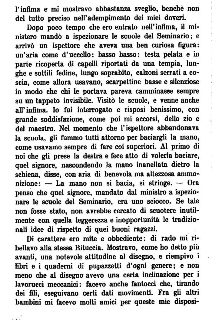 Dopo poco tempo che ero entrato nell'infima, il ministero mandò a ispezionare le scuole del Seminario; e arrivò un ispettore che aveva una ben curiosa figura: un'aria come d'uccello: basso basso: testa pelata e in parte ricoperta di capelli riportati da una tempia, lunghe e sottili fedine, lungo soprabito, calzoni serrati a coscia, come allora usavano, scarpettine basse e silenziose in modo che chi le portava pareva camminasse sempre su un tappeto invisibile. Visitò le scuole, e venne anche all'infima. Io fui interrogato e risposi benissimo, con grande soddisfazione, come poi mi accorsi, dello zio e del maestro. Nel momento che l'ispettore abbandonava la scuola, gli fummo tutti attorno per baciargli la mano, come usavamo sempre di fare coi superiori. Al primo di noi che gli prese la destra e fece atto di volerla baciare, quel signore, nascondendo la mano inanellata dietro la schiena, disse, con aria di benevola ma altezzosa ammonizione: — La mano non si bacia, si stringe. — Ora penso che quel signore, mandato dal ministro a ispezionare le scuole del Seminario, era uno sciocco. Se tale non fosse stato, non avrebbe cercato di scuotere inutilmente con quella leggerezza e inopportunità le tradizionali idee di rispetto di quei buoni ragazzi.