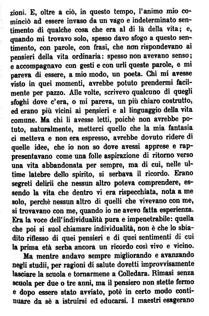 zioni. E, oltre a ciò, in questo tempo, l'animo mio cominciò ad essere invaso da un vago e indeterminato sentimento di qualche cosa che era al di là della vita; e, quando mi trovavo solo, spesso davo sfogo a questo sentimento, con parole, con frasi, che non rispondevano ai pensieri della vita ordinaria: spesso non avevano senso; e accompagnavo con gesti e con urli queste parole, e mi pareva di essere, a mio modo, un poeta. Chi mi avesse visto in quei momenti, avrebbe potuto prendermi facilmente per pazzo. Alle volte, scrivevo qualcuno di quegli sfoghi dove c'era, o mi pareva, un più chiaro costrutto, ed erano più vicini ai pensieri e al linguaggio della vita comune. Ma chi li avesse letti, poiché non avrebbe potuto, naturalmente, metterci quello che la mia fantasia ci metteva e non era espresso, avrebbe dovuto ridere di quelle idee, che io non so dove avessi apprese e rappresentavano come una folle aspirazione di ritorno verso una vita abbandonata per sempre, ma di cui, nelle ultime latebre dello spirito, si serbava il ricordo. Erano segreti delirìi che nessun altro poteva comprendere, essendo la vita che dentro vi era rispecchiata, nota a me solo, perchè nessun altro di quelli che vivevano con me, si trovavano con me, quando io ne avevo fatta esperienza. Era la voce dell'individualità pura e impenetrabile: quella che poi si suol chiamare individualità, non è che lo sbiadito riflesso di quei pensieri e di quei sentimenti di cui la prima età serba ancora un ricordo così vivo e vicino.