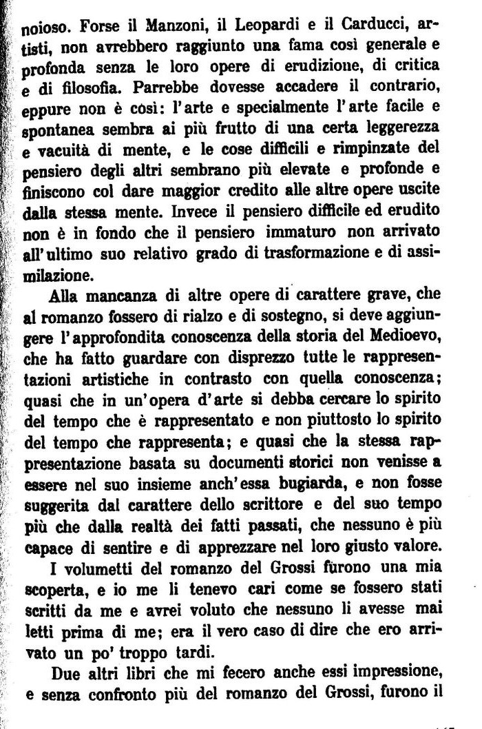 , Alla mancanza di altre opere di carattere grave, che , al romanzo fossero di rialzo e di sostegno, si deve aggiun-I gere l'approfondita conoscenza della storia del Medioevo, , che ha fatto guardare con disprezzo tutte le rappresen-, fazioni artistiche in contrasto con quella conoscenza; ! quasi che in un'opera d'arte si debba cercare lo spirito , del tempo che è rappresentato e non piuttosto lo spirito , del tempo che rappresenta; e quasi che la stessa rap-, presentazione basata su documenti storici non venisse a k essere nel suo insieme anch'essa bugiarda, e non fosse , suggerita dal carattere dello scrittore e del suo tempo più che dalla realtà dei fatti passati, che nessuno è più capace di sentire e di apprezzare nel loro giusto valore. ! I volumetti del romanzo del Grossi furono una mia scoperta, e io me li tenevo cari come se fossero stati scritti da me e avrei voluto che nessuno li avesse mai i letti prima di me; era il vero caso di dire che ero arrivato un po' troppo tardi. , Due altri libri che mi fecero anche essi impressione, e senza confronto più del romanzo del Grossi, furono il