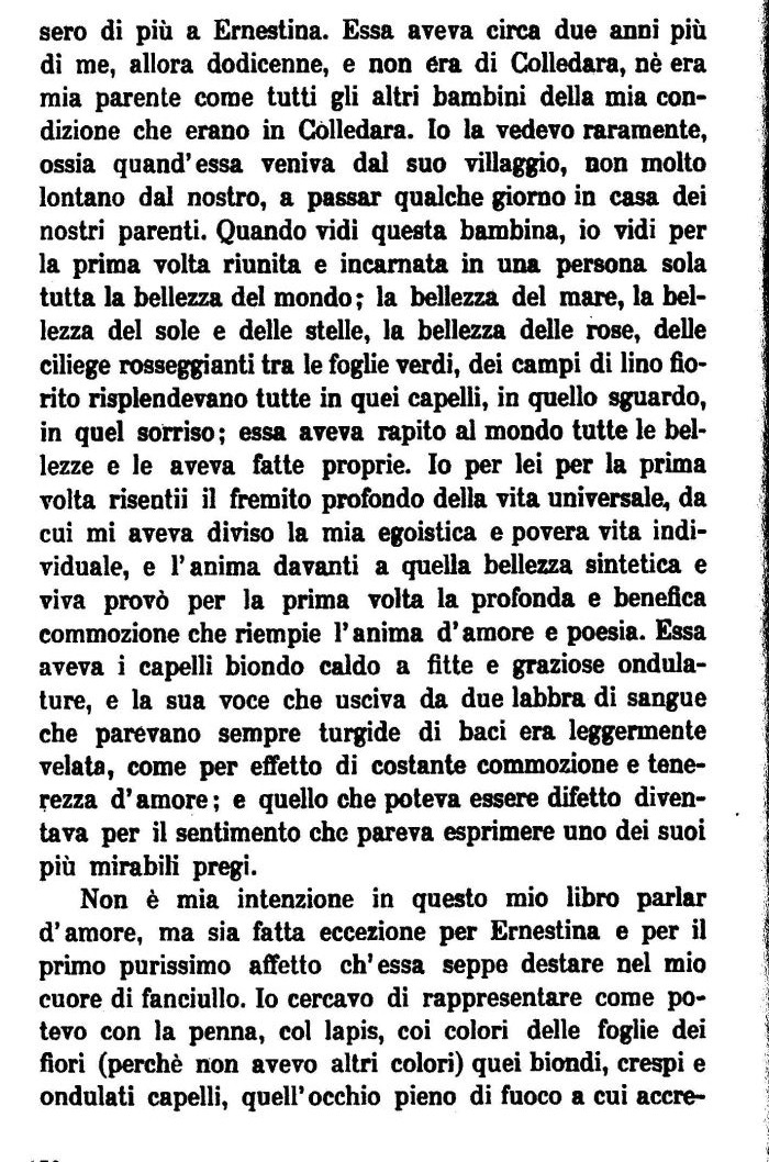 sero di pių a Ernestina. Essa aveva circa due anni pių di me, allora dodicenne, e non era di Colledara, nč era mia parente come tutti gli altri bambini della mia condizione che erano in Colledara. Io la vedevo raramente, ossia quand'essa veniva dal suo villaggio, non molto lontano dal nostro, a passar qualche giorno in casa dei nostri parenti. Quando vidi questa bambina, io vidi per la prima volta riunita e incarnata in una persona sola tutta la bellezza del mondo; la bellezza del mare, la bellezza del sole e delle stelle, la bellezza delle rose, delle ciliege rosseggianti tra le foglie verdi, dei campi di lino fiorito risplendevano tutte in quei capelli, in quello sguardo, in quel sorriso; essa aveva rapito al mondo tutte le bellezze e le aveva fatte proprie. Io per lei per la prima volta risentii il fremito profondo della vita universale, da cui mi aveva diviso la mia egoistica e povera vita individuale, e l'anima davanti a quella bellezza sintetica e viva provō per la prima volta la profonda e benefica commozione che riempie l'anima d'amore e poesia. Essa aveva i capelli biondo caldo a fėtte e graziose ondula-ture, e la sua voce che usciva da due labbra di sangue che parevano sempre turgide di baci era leggermente velata, come per effetto di costante commozione e tenerezza d'amore; e quello che poteva essere difetto diventava per il sentimento che pareva esprimere uno dei suoi pių mirabili pregi.