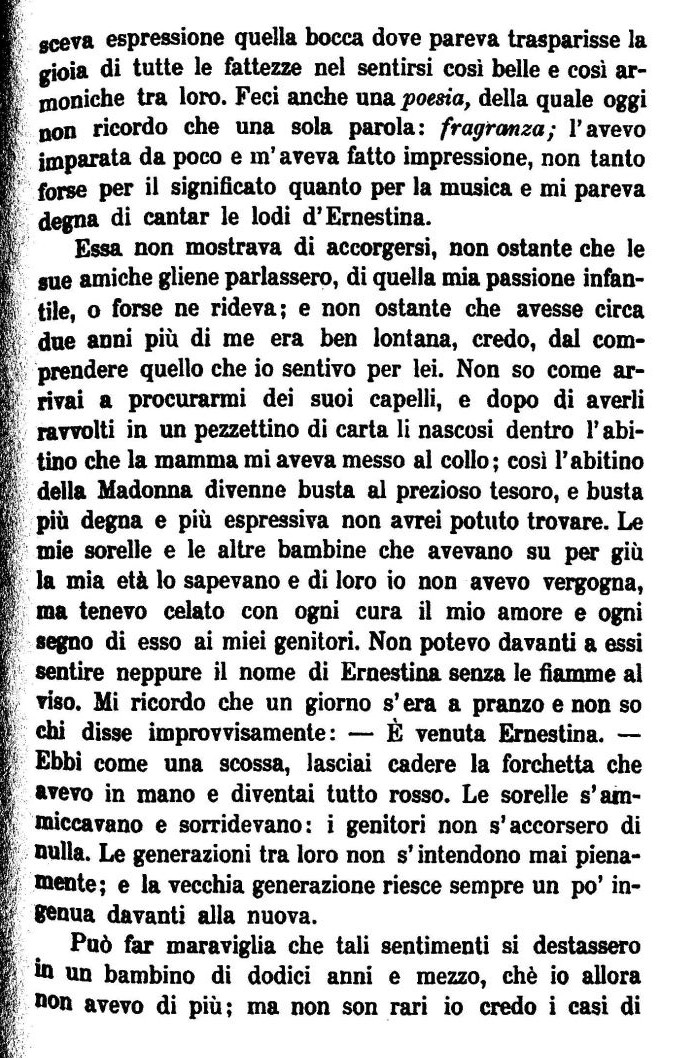 scava espressione quella bocca dove pareva trasparisse la gioia di tutte le fattezze nel sentirsi così belle e così armoniche tra loro. Feci anche una poesia, della quale oggi non ricordo che una sola parola: fragranza; l'avevo Imparata da poco e m'aveva fatto impressione, non tanto forse per il significato quanto per la musica e mi pareva degna di cantar le lodi d'Ernestina.