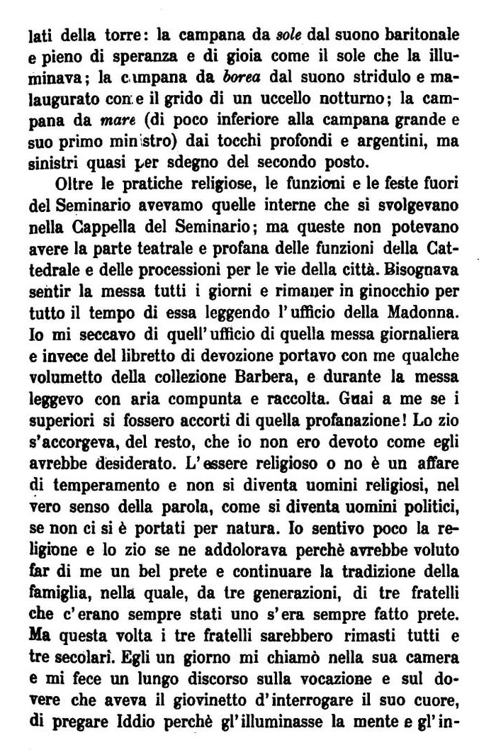 Oltre le pratiche religiose, le funzioni e le feste fuori del Seminario avevamo quelle interne che si svolgevano nella Cappella del Seminario; ma queste non potevano avere la parte teatrale e profana delle funzioni della Cattedrale e delle processioni per le vie della città. Bisognava sentir la messa tutti i giorni e rimaner in ginocchio per tutto il tempo di essa leggendo l'ufficio della Madonna. Io mi seccavo di quell' ufficio di quella messa giornaliera e invece del libretto di devozione portavo con me qualche volumetto della collezione Barbera, e durante la messa leggevo con aria compunta e raccolta. Guai a me se i superiori si fossero accorti di quella profanazione! Lo zio s'accorgeva, del resto, che io non ero devoto come egli avrebbe desiderato. L'essere religioso o no è un affare di temperamento e non si diventa uomini religiosi, nel vero senso della parola, come si diventa uomini politici, se non ci si è portati per natura. Io sentivo poco la religione e lo zio se ne addolorava perchè avrebbe voluto far di me un bel prete e continuare la tradizione delia famiglia, nella quale, da tre generazioni, di tre fratelli che c'erano sempre stati uno s'era sempre fatto prete. Ma questa volta i tre fratelli sarebbero rimasti tutti e tre secolari. Egli un giorno mi chiamò nella sua camera e mi fece un lungo discorso sulla vocazione e sul dovere che aveva il giovinetto d'interrogare il suo cuore, di pregare Iddio perchè gì'illuminasse la mente e gl'in-