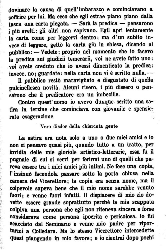 La satira era nota solo a uno o due miei amici e io non ci pensavo quasi più, quando tutto a un tratto, per invidia delle mie gloriole artistico-letterarie, essa fu il pugnale di cui si servi per ferirmi uno di quelli che pareva essere tra i miei amici più intimi. Ne fece una copia, l'insinuò facendola passare sotto la porta chiusa nella camera del Vicerettore; la copia era senza nome, ma il colpevole sapeva bene che il mio nome sarebbe venuto fuori; e venne fuori infatti. Il dispiacere di mio zio dovette essere grande soprattutto perchè la mia scappata colpiva una persona che egli non riteneva sincera e forse considerava come persona ipocrita e pericolosa. Io fui scacciato dal Seminario e venne mio padre per riportarmi a Colledara. Ma lo stesso Vicerettore intercedette quasi piangendo in mio favore; e io rientrai dopo pochi