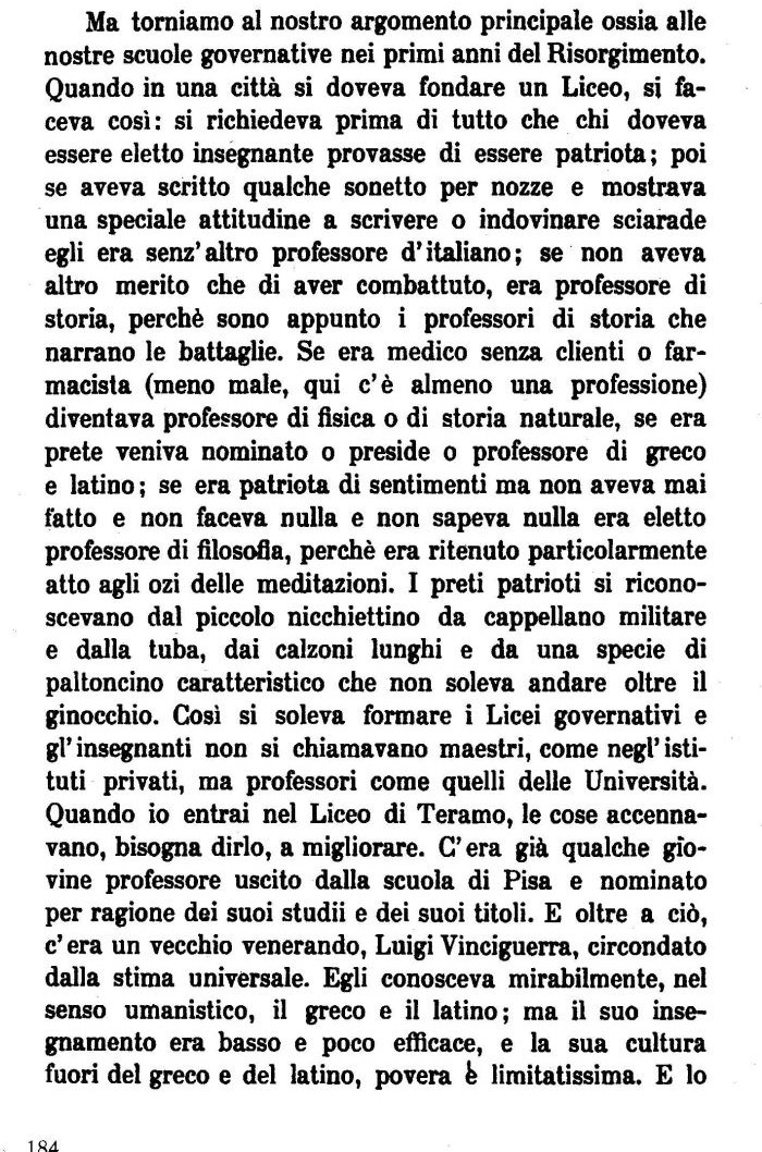Ma torniamo al nostro argomento principale ossia alle nostre scuole governative nei primi anni del Risorgimento. Quando in una città si doveva fondare un Liceo, si faceva così : si richiedeva prima di tutto che chi doveva essere eletto insegnante provasse di essere patriota; poi se aveva scritto qualche sonetto per nozze e mostrava una speciale attitudine a scrivere o indovinare sciarade egli era senz'altro professore d'italiano; se non aveva altro merito che di aver combattuto, era professore di storia, perchè sono appunto i professori di storia che narrano le battaglie. Se era medico senza clienti o farmacista (meno male, qui c'è almeno una professione) diventava professore di fisica o di storia naturale, se era prete veniva nominato o preside o professore di greco e latino ; se era patriota di sentimenti ma non aveva mai tatto e non faceva nulla e non sapeva nulla era eletto professore di filosofia, perchè era ritenuto particolarmente atto agli ozi delle meditazioni. I preti patrioti si riconoscevano dal piccolo nicchiettino da cappellano militare e dalla tuba, dai calzoni lunghi e da una specie di paltoncino cara