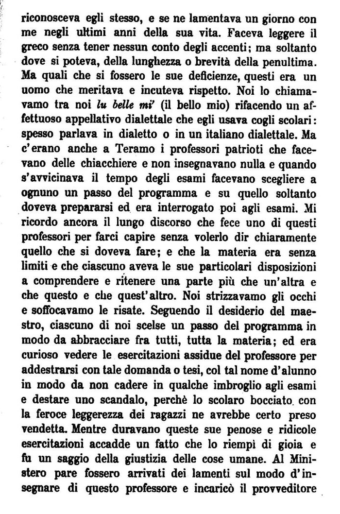 riconosceva egli stesso, e se ne lamentava un giorno con me negli ultimi anni della sua vita. Faceva leggere il greco senza tener nessun conto degli accenti; ma soltanto dove si poteva, della lunghezza o brevità della penultima. Ma quali che si fossero le sue deficienze, questi era un uomo che meritava e incuteva rispetto. Noi lo chiamavamo tra noi lu belle mi' (il bello mio) rifacendo un affettuoso appellativo dialettale che egli usava cogli scolari : spesso parlava in dialetto o in un italiano dialettale. Ma c'erano anche a Teramo i professori patrioti che facevano delle chiacchiere e non insegnavano nulla e quando s'avvicinava il tempo degli esami facevano scegliere a ognuno un passo del programma e su quello soltanto doveva prepararsi ed era interrogato poi agli esami. Mi ricordo ancora il lungo discorso che fece uno di questi professori per farci capire senza volerlo dir chiaramente quello che si doveva fare; e che la materia era senza limiti e che ciascuno aveva le sue particolari disposizioni a comprendere e ritenere una parte più che un'altra e che questo e che quest'altro. Noi strizzavamo gli occhi e soffocavamo le risate. Seguendo il desiderio del maestro, ciascuno di noi scelse un passo del programma in modo da abbracciare fra tutti, tutta la materia; ed era curioso vedere le esercitazioni assidue del professore per addestrarsi con tale domanda o tesi, col tal nome d'alunno in modo da non cadere in qualche imbroglio agli esami e destare uno scandalo, perchè lo scolaro bocciato, con la feroce leggerezza dei ragazzi ne avrebbe certo preso vendetta. Mentre duravano queste sue penose e ridicole esercitazioni accadde un fatto che lo riempi di gioia e fu un saggio della giustizia delle cose umane. Al Ministero pare fossero arrivati dei lamenti sul modo d'insegnare di questo professore e incaricò il provveditore