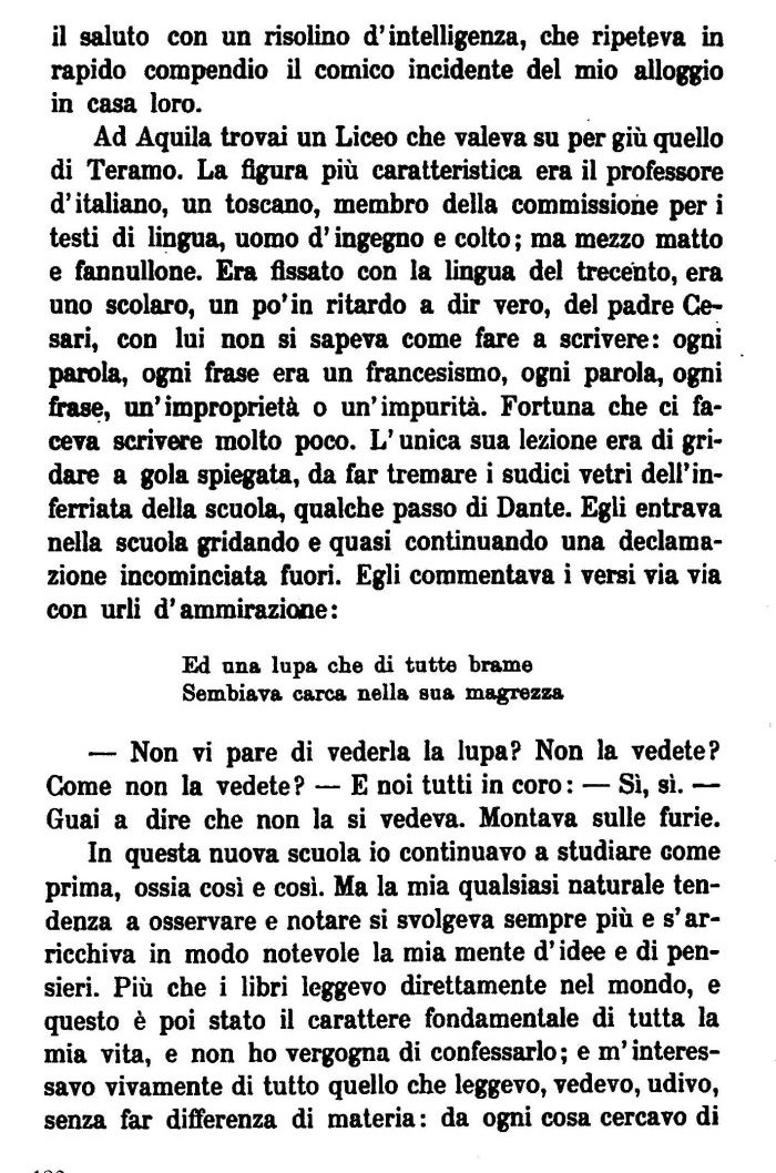 Ad Aquila trovai un Liceo che valeva su per giù quello di Teramo. La figura più caratteristica era il professore d'italiano, un toscano, membro della commissione per i testi di lingua, uomo d'ingegno e colto; ma mezzo matto e fannullone. Era fissato con la lingua del trecento, era uno scolaro, un po'in ritardo a dir vero, del padre Cesari, con lui non si sapeva come fare a scrivere: ogni parola, ogni frase era un francesismo, ogni parola, ogni frase, un'improprietà o un'impurità. Fortuna che ci faceva scrivere molto poco. L'unica sua lezione era di gridare a gola spiegata, da far tremare i sudici vetri dell'inferriata della scuola, qualche passo di Dante. Egli entrava nella scuola gridando e quasi continuando una declamazione incominciata fuori. Egli commentava i versi via via con urli d'ammirazione: