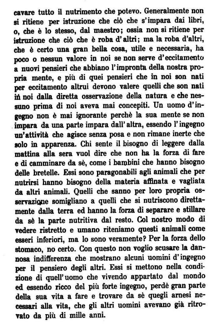cavare tatto il nutrimento che potevo. Generalmente non si ritiene per istruzione che ciò che s'impara dai libri, o, che è lo stesso, dal maestro; ossia non si ritiene per istruzione che ciò che è roba d'altri; ma la roba d'altri, che è certo una gran bella cosa, utile e necessaria, ha poco o nessun valore in noi se non serve d'eccitamento a nuovi pensieri che abbiano l'impronta della nostra propria mente, e più di quei pensieri che in noi son nati per eccitamento altrui devono valere quelli che son nati ià noi dalla diretta osservazione della natura e che nessuno prima di noi aveva mai concepiti. Un uomo d'ingegno non è mai ignorante perchè la sua mente se non impara da una parte impara dall' altra, essendo l'ingegno un'attività che agisce senza posa e non rimane inerte che solo in apparenza. Chi sente il bisogno di leggere dalla mattina alla sera vuol dire che non ha la forza di fare e di camminare da sè, come i bambini che hanno bisogno delle bretelle. Essi sono paragonabili agli animali che per nutrirsi hanno bisogno della materia affinata e vagliata da altri animali. Quelli che sanno per loro propria osservazione somigliano a quelli che si nutriscono direttamente dalla terra ed hanno la forza di separare e stillare da sè la parte nutritiva dal resto. Col nostro modo di vedere ristretto e umano riteniamo questi animali come esseri inferiori, ma lo sono veramente? Per la forza dello stomaco, no certo. Con questo non voglio scusare la dannosa indifferenza che mostrano alcuni uomini d'ingegno per il pensiero degli altri. Essi si mettono nella condizione di quell'uomo che vivendo appartato dal mondo ed essendo ricco del più forte ingegno, perdè gran parte della sua vita a fare e trovare da sè quegli arnesi necessari alla vita, che gli altri uomini avevano già ritrovato da più di mille anni.