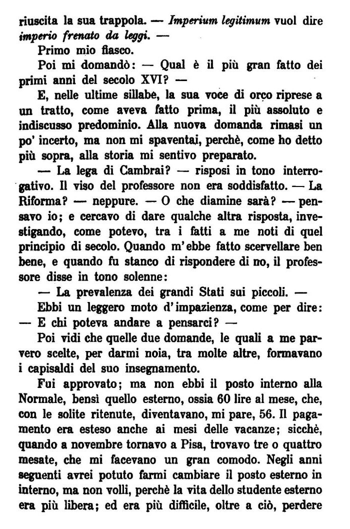 Fui approvato; ma non ebbi il posto interno alla Normale, bensì quello esterno, ossia 60 lire al mese, che, con le solite ritenute, diventavano, mi pare, 56. Il pagamento era esteso anche ai mesi delle vacanze; sicché, quando a novembre tornavo a Pisa, trovavo tre o quattro mesate, che mi facevano un gran comodo. Negli anni seguenti avrei potuto farmi cambiare il posto esterno in interno, ma non volli, perchè la vita dello studente esterno era più libera; ed era più difficile, oltre a ciò, perdere