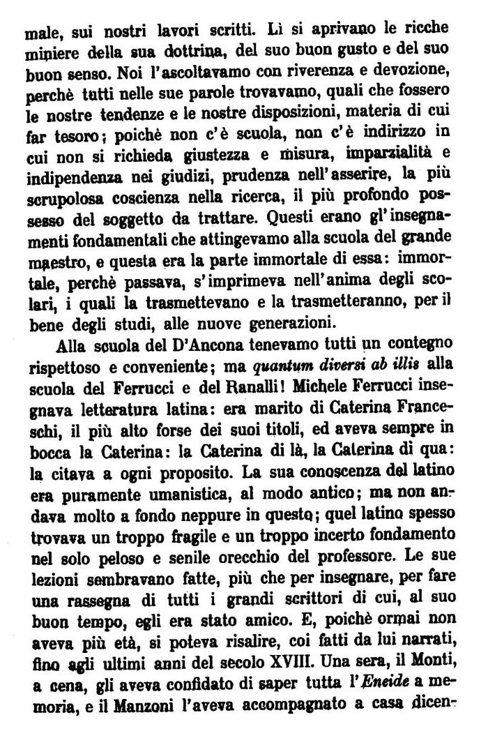 Alla souola del D'Ancona tenevamo tutti un contegno rispettoso e conveniente ; ma quantum diversi ab illis alla scuola del Ferrucci e del Banalli! Michele Ferrucci insegnava letteratura latina: era marito di Caterina Franceschi, il più alto forse dei suoi titoli, ed aveva sempre in bocca la Caterina: la Caterina di là, la Caterina dì qua: la citava a ogni proposito. La sua conoscenza del latino era puramente umanistica, al modo antico; manonanr dava molto a fondo neppure in questq; quel latino spesso trovava un troppo fragile e un troppo incerto fondamento nel solo peloso e senile orecchio del professore. Le sue lezioni sembravano fatte, più che per insegnare, per fare una rassegna di tutti i grandi scrittori di cui, al suo buon tempo, egli era stato amico. E, poiché ormai non aveva più età, si poteva risalire, coi fatti da lui narrati, fino agli ultimi anni del secolo XVIII. Una sera, il Monti, a cena, gli aveva confidato di saper tutta l'Eneide a memoria, e il Manzoni l'aveva accompagnato a casa dicen-