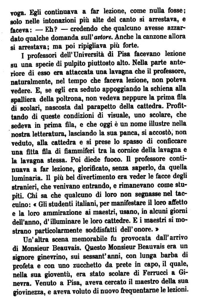 I professori dell'Università di Pisa facevano lezione su una specie di pulpito piuttosto alto. Nella parte anteriore di esso era attaccata una lavagna che il professore, naturalmente, nel tempo che faceva lezione, non poteva vedere. E, se egli era seduto appoggiando la schiena alla spalliera della poltrona, non vedeva neppure la prima fila di scolari, nascosta dal parapetto della cattedra. Profittando di queste condizioni di visuale, uno scolare, che sedeva in prima fila, e che oggi è un nome illustre nella nostra letteratura, lasciando la sua panca, si accostò, non veduto, alla cattedra e si prese lo spasso di conficcare una fitta fila di fiammiferi tra la cornice della lavagna e la lavagna stessa. Poi diede fuoco. Il professore continuava a far lezione, glorificato, senza saperlo, da quella luminaria. Il più bei divertimento era veder le facce degli stranieri, che venivano entrando, e rimanevano come stupiti. Chi sa che qualcuno di loro non segnasse nel taccuino: « Gli studenti italiani, per manifestare il loro affetto e la loro ammirazione ai maestri, usano, in alcuni giorni dell'anno, d'illuminare le loro cattedre. E i maestri si mostrano particolarmente soddisfatti dell'onore. »