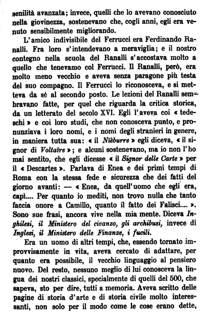 L'amico indivisibile del Ferrucci era Ferdinando Ranalli. Fra loro s'intendevano a meraviglia; e il nostro contegno nella scuola del Ranalli s'accostava molto a quello che tenevamo col Ferrucci. Il Ranalli, peṛ, era molto meno vecchio e aveva senza paragone più testa del suo compagno. Il Ferrucci lo riconosceva, e si metteva da sè al secondo posto. Le lezioni del Ranalli sembravano fatte, per quel che riguarda la critica storica, da un letterato del secolo XVI. Egli l'aveva coi « tedeschi » e coi loro studi, che non conosceva punto, e pronunziava i loro nomi, e i nomi degli stranieri in genere, in maniera tutta sua: « il Ńèburre » egli diceva, « il signor di Voltaire » ; e alcuni sostenevano, ma io non l'ho mai sentito, che egli dicesse « il Signor delle Carte » per il « Descartes ». Parlava di Enea e dei primi tempi di Roma con la stessa fede e sicurezza che dei fatti del giorno avanti: — «Enea, da quell'uomo che egli era, Caṕ.... Per quanto io mediti, non trovo nulla che tanto faccia onore a Camillo, quanto il fatto dei Falisci.... ». Sono sue frasi, ancora vive nella mia mente. Diceva In-ghilesi, il Ministero del civanzo, gli archibusi, invece di Inglesi, il Ministero delle Finanze, i fucili.