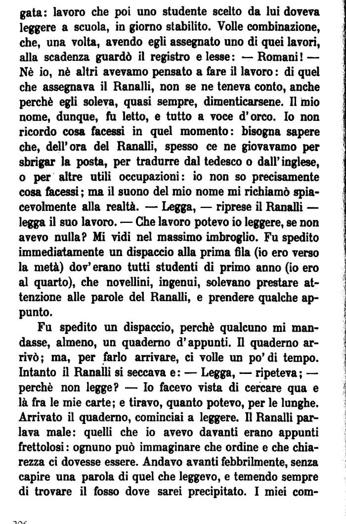 gala: lavoro che poi uno studente scelto da lui doveva leggere a scuola, in giorno stabilito. Volle combinazione, che, una volta, avendo egli assegnato uno di quei lavori, alla scadenza guardò il registro e lesse: — Romani! — Nè io, nè altri avevamo pensato a fare il lavoro : di quel che assegnava il Ranalli, non se ne teneva conto, anche perchè egli soleva, quasi sempre, dimenticarsene. Il mio nome, dunque, fa letto, e tutto a voce d'orco. Io non ricordo cosa facessi in quel momento: bisogna sapere che, dell'ora del Ranalli, spesso ce ne giovavamo per sbrigar la posta, per tradurre dal tedesco o dall'inglese, o per altre utili occupazioni: io non so precisamente cosa facessi ; ma il suono del mio nome mi richiamò spiacevolmente alla realtà. — Legga, — riprese il Ranalli — legga il suo lavoro. — Che lavoro potevo io leggere, se non avevo nulla? Mi vidi nel massimo imbroglio. Fu spedito immediatamente un dispaccio alla prima fila (io ero verso la metà) dov' erano tutti studenti di primo anno (io ero al quarto), che novellini, ingenui, solevano prestare attenzione alle parole del Ranalli, e prendere qualche appunto.