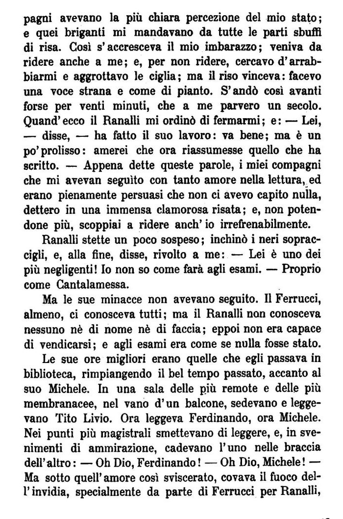 Le sue ore migliori erano quelle che egli passava in biblioteca, rimpiangendo il bel tempo passato, accanto al suo Michele. In una sala delle più remote e delle più membranacee, nel vano d'un balcone, sedevano e leggevano Tito Livio. Ora leggeva Ferdinando, ora Michele. Nei punti più magistrali smettevano di leggere, e, in svenimenti di ammirazione, cadevano l'uno nelle braccia dell'altro : — Oh Dio, Ferdinando ! — Oh Dio, Michele! — Ma sotto quell' amore così sviscerato, covava il fuoco dell' invidia, specialmente da parte di Ferrucci per Ranalli,