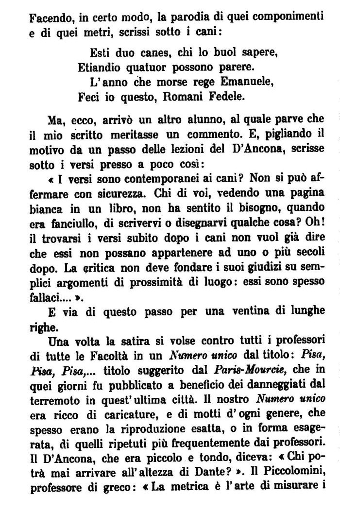 Una volta la satira si volse contro tutti i professori di tutte le Facoltà in un Numero unico dal titolo : Pisa, Pisa, Pisa,... titolo suggerito dal Paris-Mourcie, che in quei giorni fu pubblicato a benefìcio dei danneggiati dal terremoto in quest'ultima città. II nostro Numero unico era ricco di caricature, e di motti d'ogni genere, che spesso erano la riproduzione esatta, o in forma esagerata, di quelli ripetuti più frequentemente dai professori. 11 D'Ancona, che era piccolo e tondo, diceva: « Chi potrà mai arrivare all'altezza di Dante? ». Il Piccolomini, professore di greco : « La metrica è l'arte di misurare i