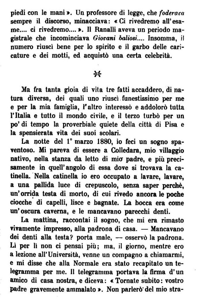 Ma fra tanta gioia di vita tre fatti accaddero, di natura diversa, dei quali uno riuscì funestissimo per me e per la mia famiglia, l'altro interessò e addolorò tutta l'Italia e tutto il mondo civile, e il terzo turbò per un po' di tempo la proverbiale quiete della città di Pisa e la spensierata vita dei suoi scolari.
