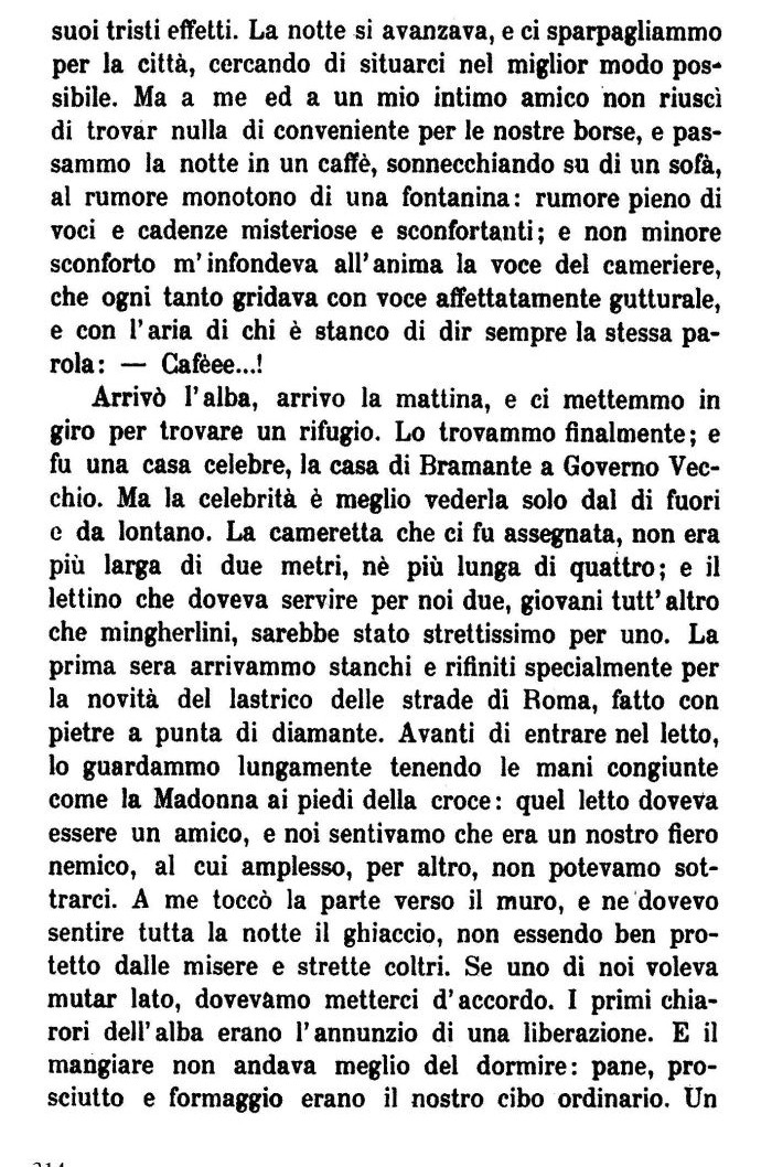 Arrivò l'alba, arrivo la mattina, e ci mettemmo in giro per trovare un rifugio. Lo trovammo finalmente ; e fu una casa celebre, la casa di Bramante a Governo Vecchio. Ma la celebrità è meglio vederla solo dal di fuori e da lontano. La cameretta che ci fu assegnata, non era più larga di due metri, nè più lunga di quattro; e il lettino che doveva servire per noi due, giovani tutt' altro che mingherlini, sarebbe stato strettissimo per uno. La prima sera arrivammo stanchi e rifiniti specialmente per la novità del lastrico delle strade di Roma, fatto con pietre a punta di diamante. Avanti di entrare nel letto, lo guardammo lungamente tenendo le mani congiunte come la Madonna ai piedi della croce : quel letto doveva essere un amico, e noi sentivamo che era un nostro fiero nemico, al cui amplesso, per altro, non potevamo sottrarci. A me toccò la parte verso il muro, e ne dovevo sentire tutta la notte il ghiaccio, non essendo ben protetto dalle misere e strette coltri. Se uno di noi voleva mutar lato, dovevamo metterci d'accordo. I primi chiarori dell'alba erano l'annunzio di una liberazione. E il mangiare non andava meglio del dormire: pane, prosciutto e formaggio erano il nostro cibo ordinario. Un