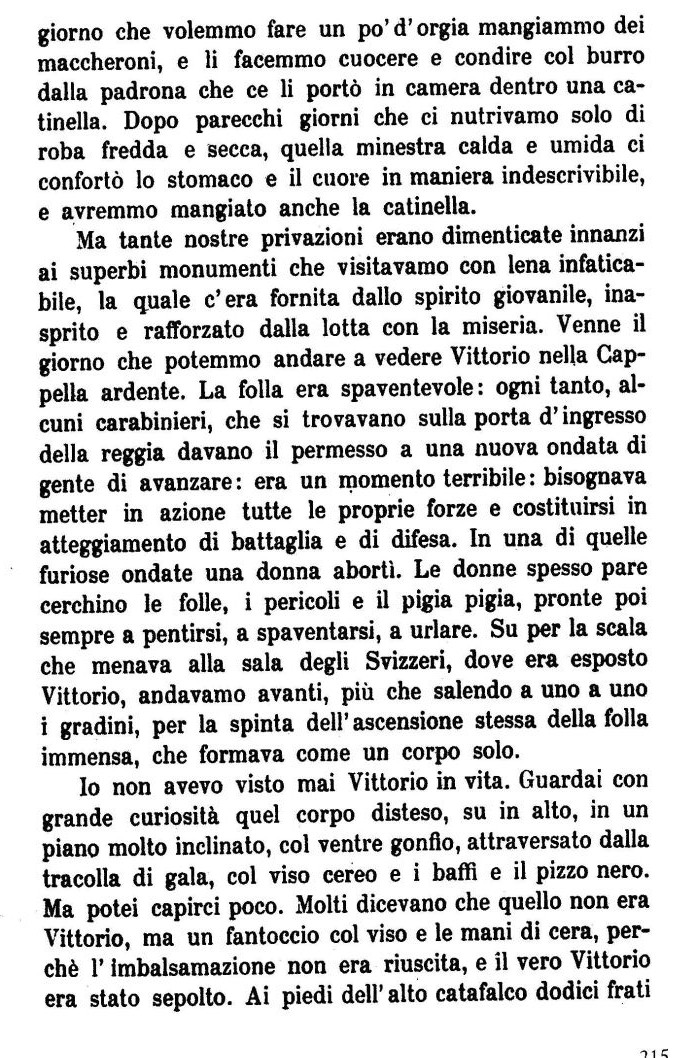 Io non avevo visto mai Vittorio in vita. Guardai con grande curiosità quel corpo disteso, su in alto, in un piano molto inclinato, col ventre gonfio, attraversato dalla tracolla di gala, col viso cereo e i baffi e il pizzo nero. Ma potei capirci poco. Molti dicevano che quello non era Vittorio, ma un fantoccio col viso e le mani di cera, perchè l'imbalsamazione non era riuscita, e il vero Vittorio era stato sepolto. Ai piedi dell' alto catafalco dodici frati