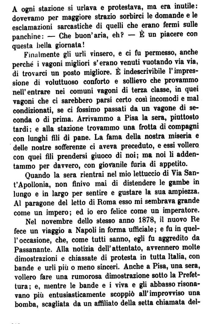 Finalmente gli urli vinsero, e ci fu permesso, anche perché i vagoni migliori s'erano venuti vuotando via via, di trovarci un posto migliore. È indescrivibile l'impressione di voluttuoso conforto e sollievo che provammo nell'entrare nei comuni vagoni di terza classe, in quei vagoni che ci sarebbero parsi certo così incomodi e mal condizionati, se ci fossimo passati da un vagone di seconda o di prima. Arrivammo a Pisa la sera, piuttosto tardi : e alla stazione trovammo una frotta di compagni con lunghi fili di pane. La fama della nostra miseria e delle nostre sofferenze ci aveva preceduto, e essi vollero con quei fili prendersi giuoco di noi; ma noi li addentammo per davvero, con giovanile furia di appetito.