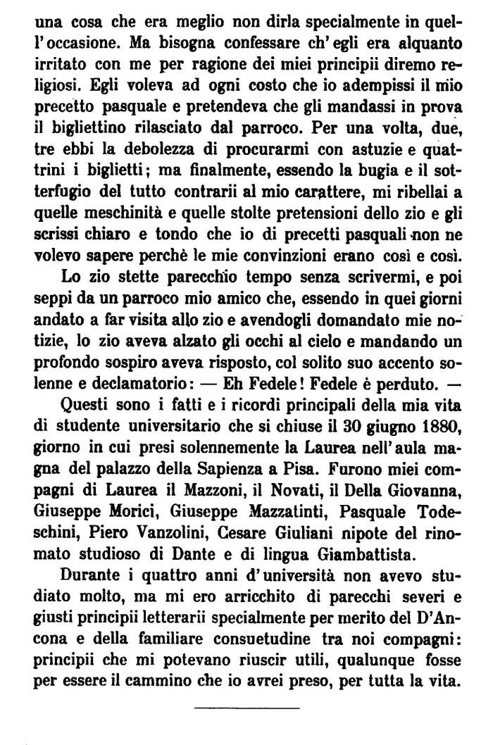 Questi sono i fatti e i ricordi principali della mia vita di studente universitario che si chiuse il 30 giugno 1880, giorno in cui presi solennemente la Laurea nell' aula magna del palazzo della Sapienza a Pisa. Furono miei compagni di Laurea il Mazzoni, il Novati, il Della Giovanna, Giuseppe Morici, Giuseppe Mazzatinti, Pasquale Tode-schini, Piero Vanzolini, Cesare Giuliani nipote del rinomato studioso di Dante e di lingua Giambattista.