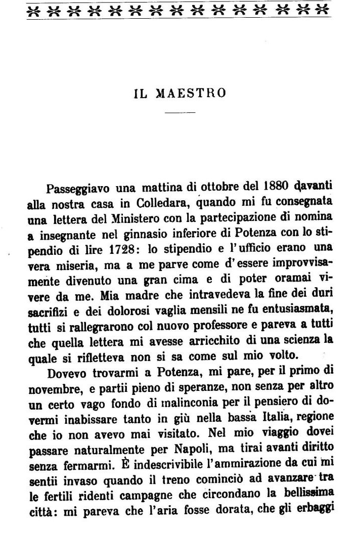 Passeggiavo una mattina di ottobre del 1880 davanti alla nostra casa in Colledara, quando mi fu consegnata una lettera del Ministero con la partecipazione di nomina a insegnante nel ginnasio inferiore di Potenza con lo stipendio di lire 1728: lo stipendio e l'ufficio erano una vera miseria, ma a me parve come d'essere improvvisamente divenuto una gran cima e di poter oramai vivere da me. Mia madre che intravedeva la fine dei duri sacrifizi e dei dolorosi vaglia mensili ne fu entusiasmata, tutti si rallegrarono col nuovo professore e pareva a tutti che quella lettera mi avesse arricchito di una scienza la quale si rifletteva non si sa come sul mio volto.