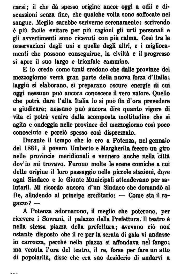 Durante il tempo che io ero a Potenza, nel gennaio del 188Ì, il povero Umberto e Margherita fecero un giro nelle provincie meridionali e vennero anche nella città dov'io mi trovavo. Furono molte le scene comiche a cui dette origine il loro passaggio nelle piccole stazioni, dqve ogni Sindaco e le Giunte Municipali attendevano per salutarli. Mi ricordo ancora d'un Sindaco che domandò al Re, alludendo al principe ereditario: — Come sta il ragazzo? —