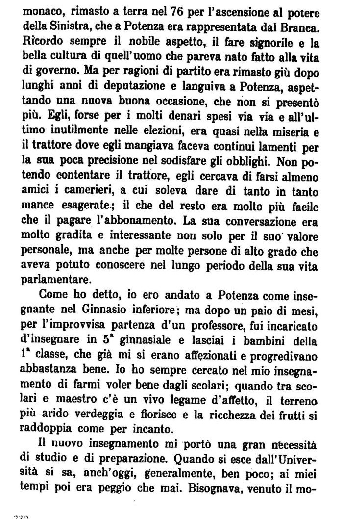 monaco, rimasto a terra nel 76 per l'ascensione al potere della Sinistra, che a Potenza era rappresentata dal Branca. Ricordo sempre il nobile aspetto, il fare signorile e la bella cultura di quell'uomo che pareva nato fatto alla vita di governo. Ma per ragioni di partito era rimasto giù dopo lunghi anni di deputazione e languiva a Potenza, aspettando una nuova buona occasione, che non si presentò più. Egli, forse per i molti denari spesi via via e all'ultimo inutilmente nelle elezioni, era quasi nella miseria e il trattore dove egli mangiava faceva continui lamenti per la sua poca precisione nel sodisfare gli obblighi. Non potendo contentare il trattore, egli cercava di farsi almeno amici i camerieri, a cui soleva dare di tanto in tanto mance esagerate.; il che del resto era molto più facile che il pagare l'abbonamento. La sua conversazione era molto gradita e interessante non solo per il suo valore personale, ma anche per molte persone di alto grado che aveva potuto conoscere nel lungo periodo della sua vita parlamentare.